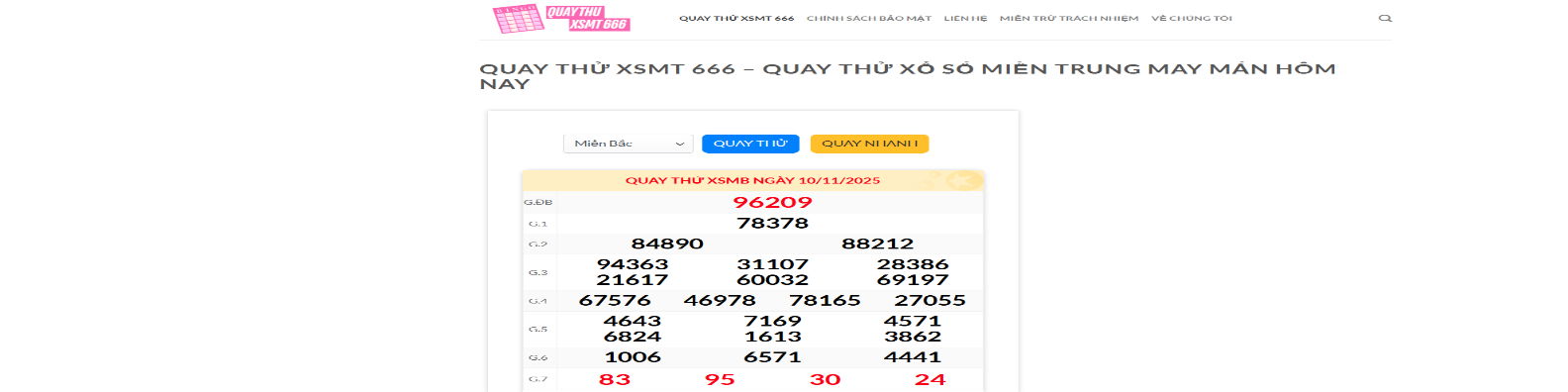 Quay Thử XSMT 666 là tiện ích quay thử xổ số miền Trung giải đặc biệt, giải tám miễn phí. Tiện ích cung cấp các con số ngẫu nhiên và là công cụ hỗ trợ bạn tham khảo cầu lô chính xác các đài Miền Trung hôm nay, ngày mai chuẩn.